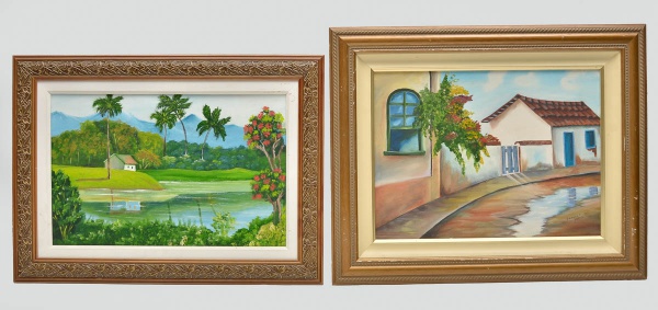 • Par de quadros  - Ost, "Casinha do Lago Verde e Subida da Tranquila" .  Verso assinado Ivanise Leite 2019 e 2006.   S/m 40x26 cm C/m 53x39 cm E S/m 38x29 cm  C/m 54x43 cm.