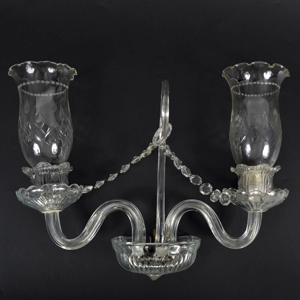 • Vive la France - Delicada e elegante arandela em demicristal para 2 luzes com mangas lapidadas. Apresenta rabo de macaco e guirlanda de pingentes, Obs.: Ausencia de pingentes nas bobeches, no estado (37x27)