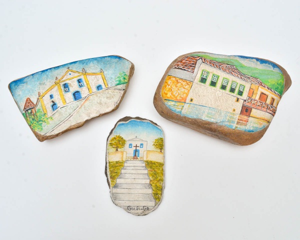 • Goiás Velho - lote composto por 3 pedras pintadas a mão, com pontos turísticos da cidade, Igreja de Santa Barbara, Igreja de São Francisco de Paula e  a Casa da poeta Cora Coralina. (17x10 / 12x7 / 16x9)