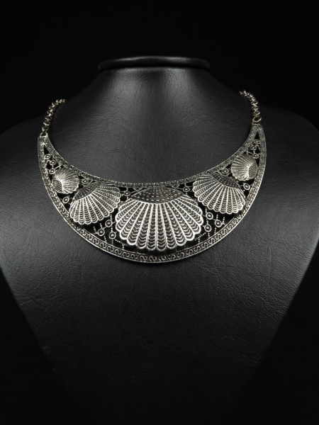 • Colar prateado estilo Cleópatra , formato meia lua , relevo com formatos de conchas e raiados. Largura maior 5 cm / 26 cm comprimento máximo