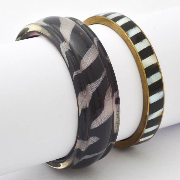 • Par de pulseiras  vintage, sendo 1 preta e incolor e 1 de madreperola e esmalte preto. 1 e 2 cm largura / 6,5 cm diametro interno