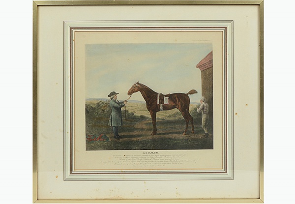 • Reprodução. DIOMED, cavalo vencedor do maio evento de relva do mundo , ocorrido em 1780, conhecido com "EPSON SERBY. S/m 41x38 cm e C/m 65x56 cm