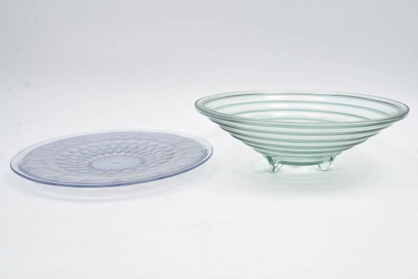 • Estilo e Elegancia - Lote composto por grande centro de mesa em vidro escalonado dito, Coliseu, base tripoide, compoe o lote 1 prato para para servir a mesa em vidro jateado com decoração de flores e frutos. (11x35 / diam 34cm)