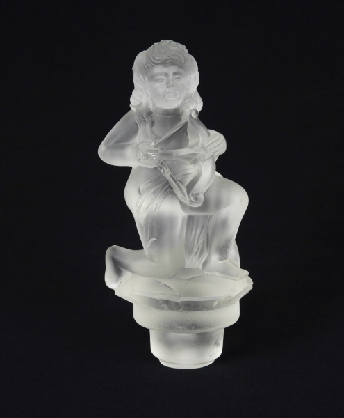 • Estatueta em vidro satine ao gosto Lalique representando "Cupido!" sobre pedestal. Base bicada e com pequena perda, necessario lapidar. 15x8 cm