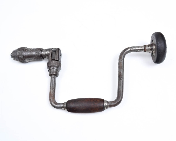 • Rara furadeira manual, antiga tipo "brace" STANLEY - USA. Elaborada em aço com cabo de manivela de madeira. Marcas de uso e tempo.  35x18 cm.