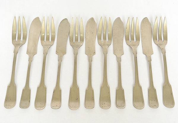 • Fish Cutlery - Lote composto por antigo faqueiro para peixe, padrão clássico francês, marca Alpaca Silco, EUA, composto por 6 garfos e 5 facas. Total 11 peças. No estado