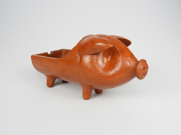 • Divertido cinzeiro em formato de porco. Todo feito de barro cozido com pintura marrom envernizada. Possui corpo vazado para comportar as cinzas e suporte para o cigarro. Med. 26 x 15cm.