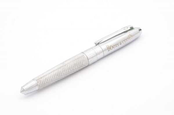 • Caneta esferografica Cutter & Buck, corpo platinado e gravado Boots & Coots. No estado