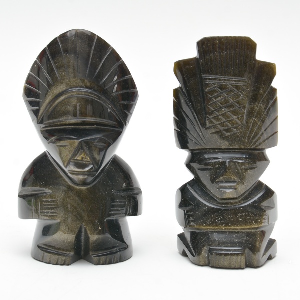 • Par de tradicionais esculturas mexicanas em obsidiana -  rocha vulcânica vítrea. No verso uma delas apresenta batido. 13x7 cm