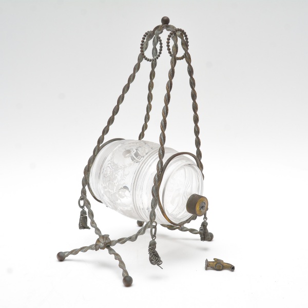 • Barril decorativo em vidro espesso, ricamente acidado (fosqueado) com delicada decoração contínua de parreiras, folhas e cachos de uvas, corpo cilíndrico com  anéis lapidados nas extremidades.A peça encontra-se suspensa e apoiada em elaborado suporte de ferro fundido, trabalhado em barras retorcidas,  motivos florais, além de alça superior decorada com contas e folhas estilizadas, evidenciando clara inspiração naturalista, típica do final do século XIX / início do século XX. Torneira solta, no estado. 32x17x18 cm