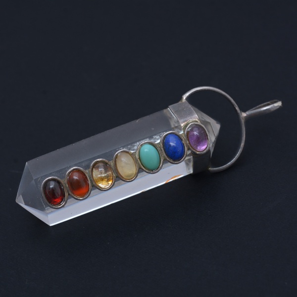 • Pingente de cristal transparente lapidado em forma prismática. Aplicação frontal de sete cabochões em pedras naturais, associados ao simbolismo dos chakras. Peça de caráter decorativo e espiritual, com acabamento polido e bom estado de conservação. 6 cm