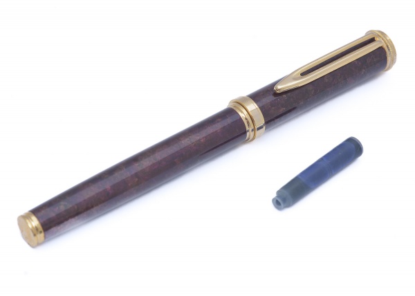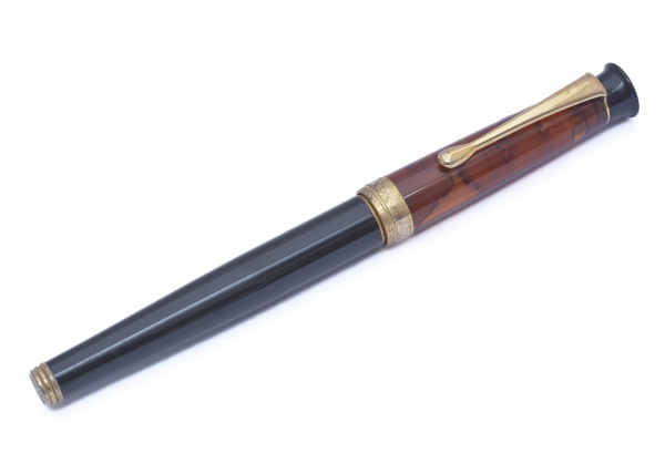 • Caneta tinteiro, corpo marmorizado com decorações em dourado. Pena bicolor Iridium Germany.