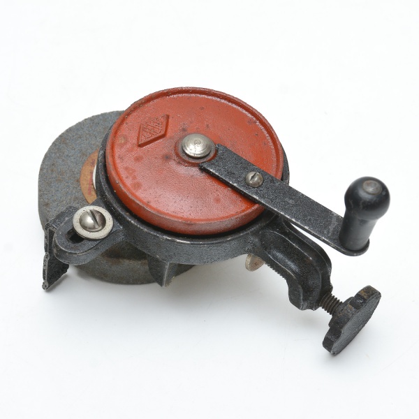 • Antigo esmeril manual de bancada, em ferro fundido, com manivela lateral e rebolo em pedra abrasiva. Modelo de fixação por morsa. Marcas do tempo e de uso. 18x12 cm.