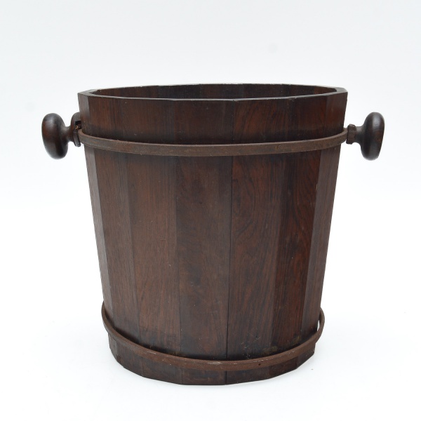 • Balde de jacarandá, corpo facetado circundado com aros em ferro forjado, pátina natural. Pequenas perdas em suas pegas. No estado, marcas do tempo. 34x26 cm.