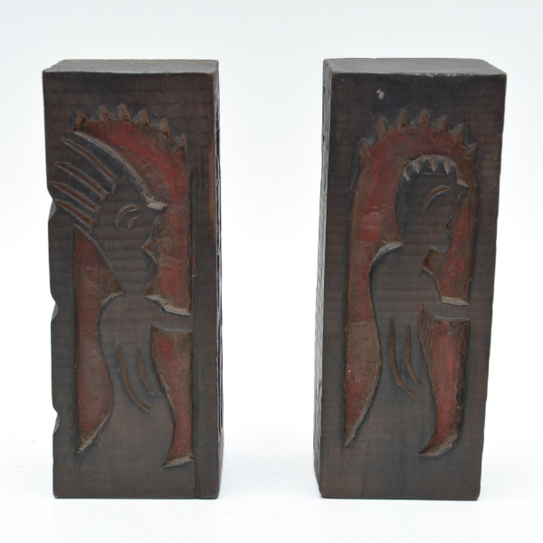 • Rústico par de serre livre em madeira maciça, com figuras antropomórficas estilizadas em baixo-relevo,  vestígios de policromia vermelha. Faces laterais entalhadas, uma delas com inscrição P O S. Marcas do tempo. 22x8,5 cm.