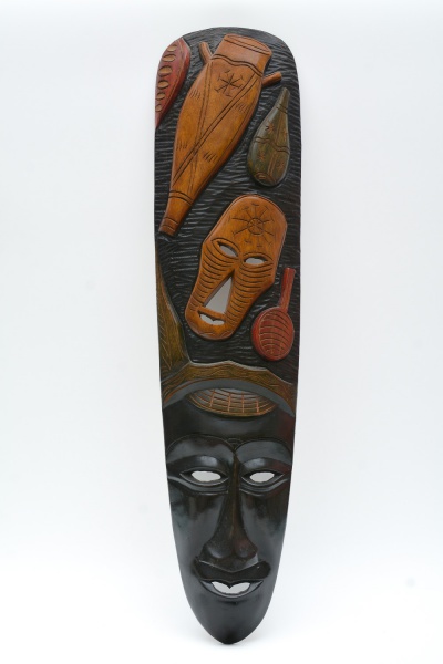 • Máscara tribal de parede em madeira, entalhada manualmente, combina áreas em madeira escura e clara, verticalmente alongada, com face estilizada de traços geométricos e elementos simbólicos em relevo na parte superior. Verso escavado. 90x21 cm.