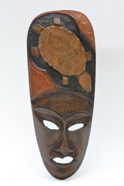 • Máscara tribal em madeira entalhada, estilização facial alongada com olhos vazados e boca recortada, decorada com representação de tataruga em relevo. 39x16 cm.