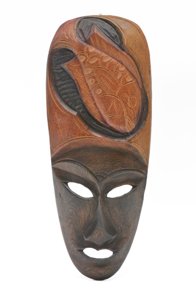 • Máscara tribal em madeira entalhada, estilização facial alongada com olhos vazados e boca recortada, decorada com representação de peixe em relevo. 40x16 cm.