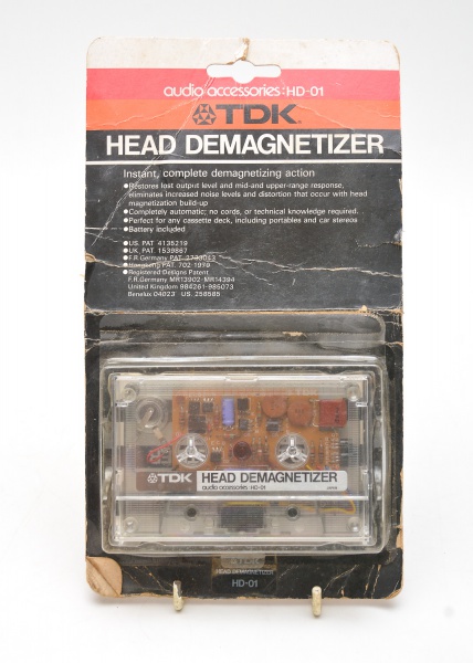 • TDK Head Demagnetizer HD-01, acessório para restauração de desempenho e redução de ruídos em equipamentos de fita. Acompanha embalagem original, Marcas do tempo. Made in Japan.  Não testado. 11x8 cm