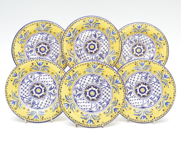 • Luiz Salvador - conjunto de 6 pratos esmaltados, com decoração policromada em azul cobalto, amarelo e branco. Composição radial centrada por rosácea geométrica. Aba larga com fundo amarelo intenso, ornamentada por volutas, folhas e cercadura pontilhada. 15 cm diam