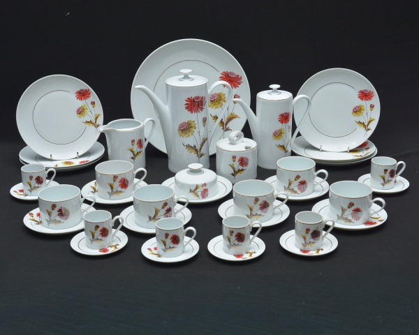 • Aparelho de porcelana Real para chá, café e bolo, de porcelana branca esmaltada, com delicada filetaria dourada nas bordas, decoração floral policromada, aplicada em ramos isolados, representando flores estilizadas de inspiração campestre, com destaque para flores abertas de pétalas radiadas em vermelho, composto por: 2 bules, 1 cremeira, 1 mantegueira, 1 açucareiro, 6 xicaras de café, 6 pires de café, 6 xícaras de chá, 6 pires de chá, 1 prato para bolo e 6 pratos de sobremesa. Total 30 pçs