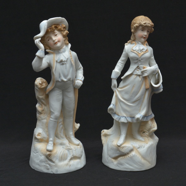 • Casal de camponeses em biscuit europeu. Figuras rurais em trajes tradicionais, com modelagem delicada esmaltados em tons claros, com detalhes em bege e dourado, típicas do final do século XIX. Apresenta pequenos bicados e fios de cabelo, no estado. 26x11 cm (maior).