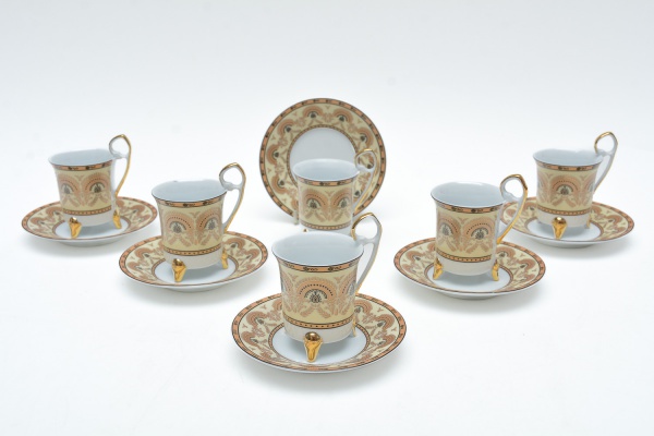 • Conjunto composto por 6 xícaras de café com seus respectivos píres em porcelana, ornamentação em tons de bege, sépia e preto, formando motivos florais. As xícaras apresentam formato cilíndrico levemente afunilado, apoiada sobre tripés dourados, com alça em douração. 11 cm diam (pires)  /  8,5x7 (xícaras) cm.