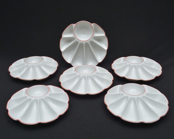 • SALER  -Conjunto de 6 petisqueiras em porcelana branca esmaltada, formato de conchas com bordas recortadas em suaves ondulações e filetes vermelhos, apresenta divisões com cavidades individuais, além de receptáculo central para pastas. 23x23 cm.