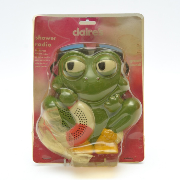 • Vintage - Antigo rádio de banheiro com representação de sapo salva vidas em plastico rígido. Acompanha embalagem original e duas ventosas. Sem marcas de uso, funcionando, sem garantias futuras.  17x17x5 cm.