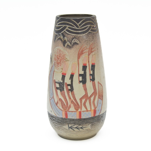 • Vaso decorativo em cerâmica pintada  estilo italiano de corpo cilíndrico levemente afunilado, com rica decoração pintada à mão em tons terrosos, ocres, pretos e vermelhos. Apresenta cenas figurativas estilizadas com homens e aves de inspiração étnica/tribal. Marcas do tempo. 20x11 cm diam.