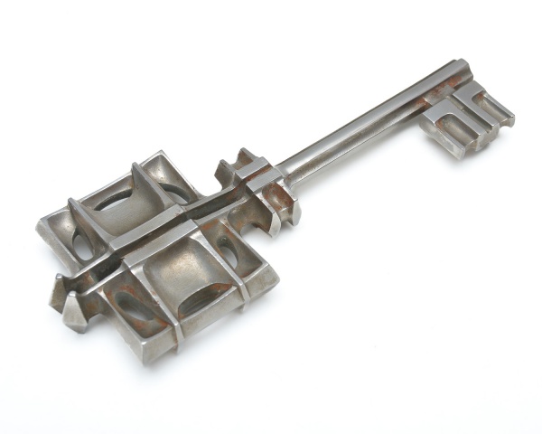 • Chave em metal, de grandes dimensões conferindo caráter escultórico, sendo maciça, com empunhadura em forma de cruz vazada, de desenho geométrico e simétrico,  corpo apresenta haste longa e seção facetada. 21x8 cm.