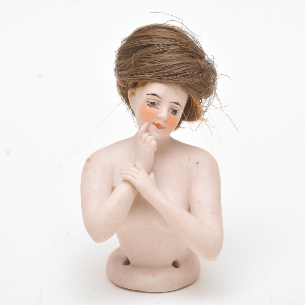 • Coleção Half Doll - Dama com cabeça inclinada e expressão elegante. Pequena perda nas pontas dos dedos e braço restaurado. 7,5x5 cm.