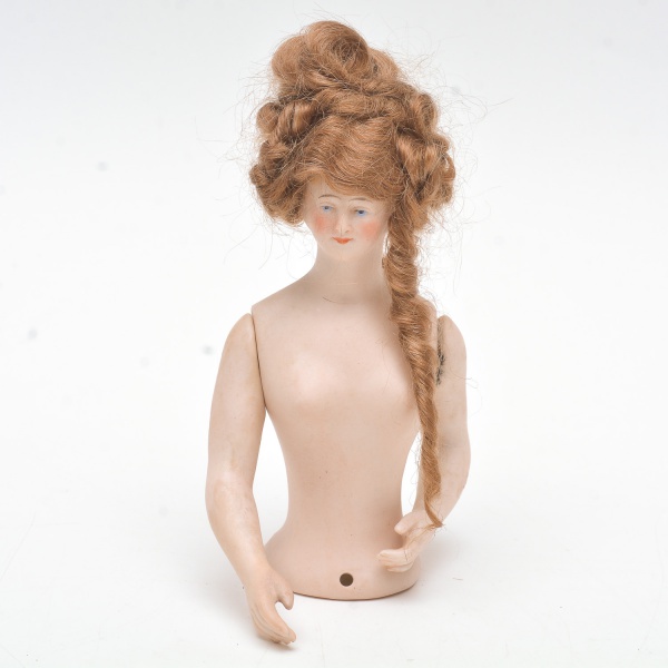 • Coleção Half Doll - boneca de biscuit, com braços  completos, peruca de cabelo dourado natural , bochechas rosadas , semblante compassivo.  16x8 cm.