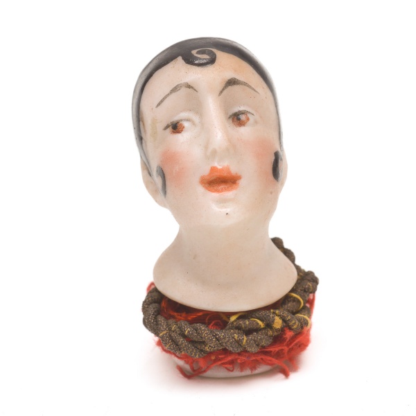 • Coleção Half Doll - Cabeça de melindrosa em porcelana com pintura manual. Rosto delicado, lábios em tom coral e sobrancelhas finas. Cabelos pretos em estilo característico da década de 1920, com mecha frontal em espiral. Base numerada 898. 4x2 cm.