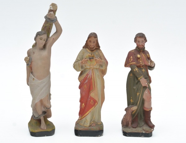 • Arte sacra - Lote composto por três pequenas esculturas sacras em estuque policromado sendo: São Roque, Sagrado Coração de Jesus e Cristo e atado à coluna. No estado, pequena perdas nas pontas dos dedos e Sagrado coração de Jesus com pequeno restauro no pescoço. 19,5x6,35 cm.