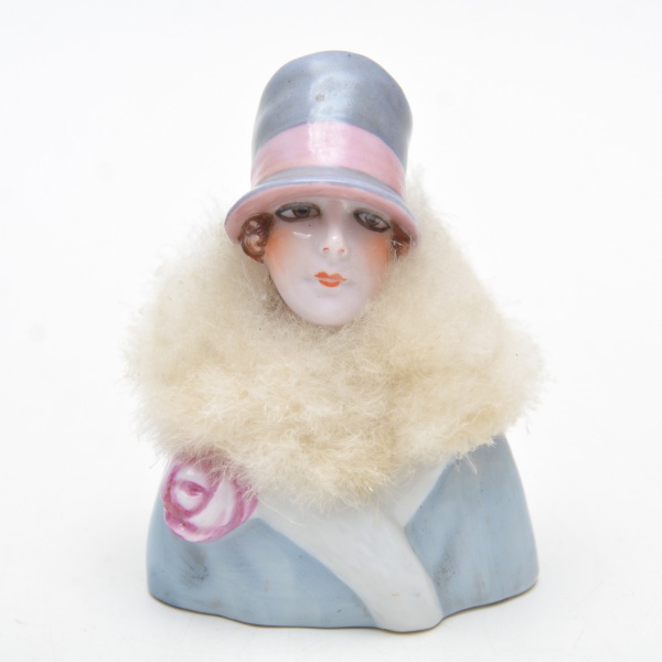 • Caixa em porcelana half doll, início do século XX, esmaltada em tom azul-claro, adornada com delicada rosa modelada em relevo. A tampa é composta por uma elegante half doll em porcelana, dama de estilo Art Déco, com rosto finamente pintado, chapéu em tons de rosa e cinza e estola em tecido felpudo original. 12X8 cm medida total da caixa com a tampa