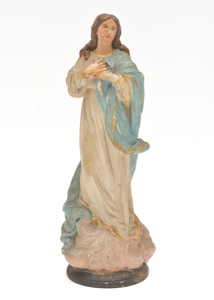 • Arte sacra - Antiga imagem Nossa Senhora da conceição em postura devocional, com mãos cruzadas ao peito. Base com marcações de fabrica. Pequenas perdas na mão, braço e face. 30,5x12 cm.