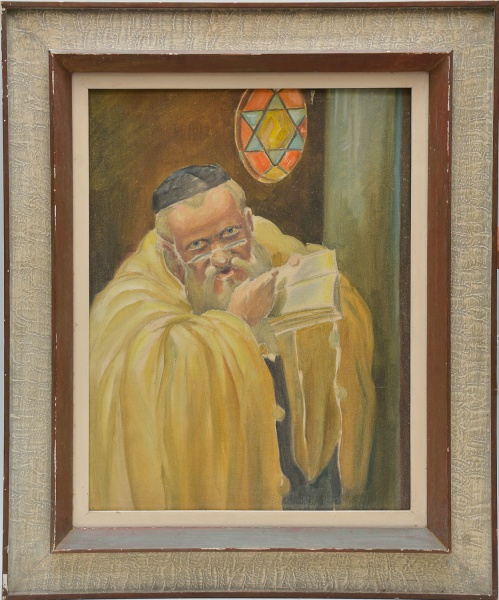 • Pintura figurativa representando ancião de tradição judaica, em meio corpo, vestindo manto claro e solidéu escuro, retratado segurando livro aberto em gesto de leitura. Ao fundo, vitral oval policromado com estrela de seis pontas. Ost. 89x73,5 cm C/M  /  63X48 CM S/M.