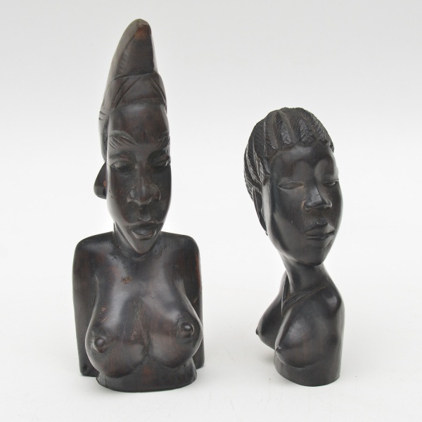 • Par de esculturas representando bustos femininos africanos talhados em madeira maciça em tonalidade escura. 19x7x5cm.