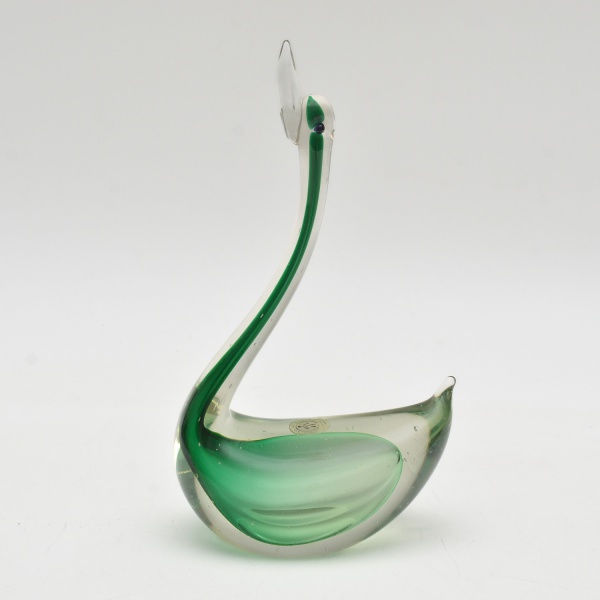 • Escultura  de cristal São Marcos com representação de cisnes em tons de verde, azul e translucido. 24x14x8 cm.