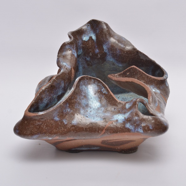 • Anos 70 - Centro de mesa em cerâmica modelada à mão, de forma livre e orgânica, com recortes e dobras esculturais que criam um efeito de movimento, com esmaltação típica do estilo pingo de leite, em tons de marrom terroso com manchas azuladas esbranquiçadas. 18x17x14 cm