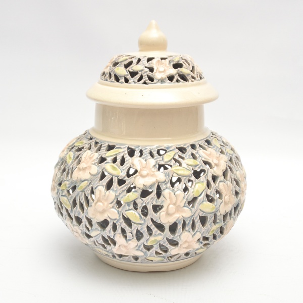 • Potiche em cerâmica vitrificada, de corpo globular e tampa abaulada com pináculo. Apresenta delicado trabalho vazado em relevo, com flores e folhas modeladas e esmaltadas em tons de marfim, verde e cinza-azulado. 28x22 cm diam.