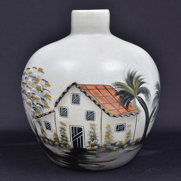 • Vaso artístico de cerâmica craquelê, com bojo acentuado, decoração campestre e destaque para inusitado telhado em alto-relevo.  25x Diametro 24 cm.