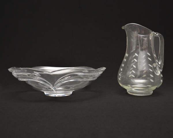 • Conjunto em cristal transparente composto por: centro de mesa com forma orgânica de pétalas suaves e jarra refresqueira com alça lateral e bico vertedor pronunciado,e aplicação decorativa de folhas foscas gravadas a ácido. 29x8  /  21x15 cm