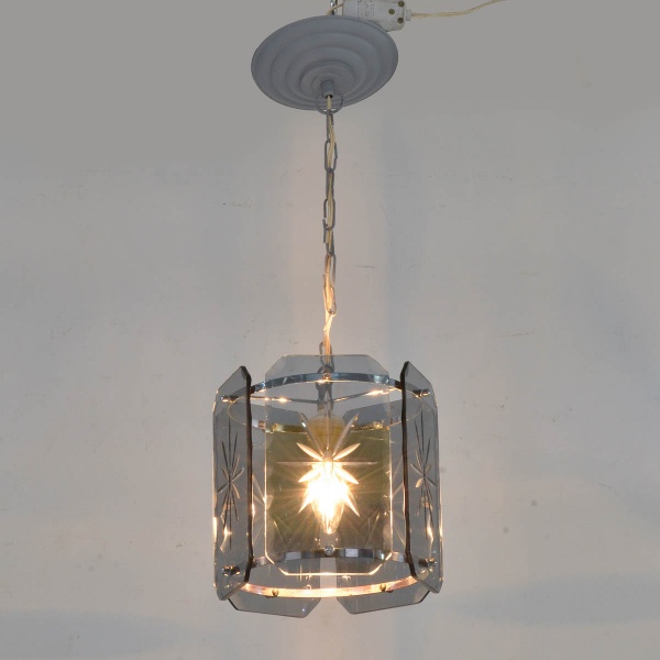 • Lustre anos 90 com cinco placas de vidro fumê com quinas de recorte facetado e lapdação estrela.  20x20 cm diam (sem corrente).