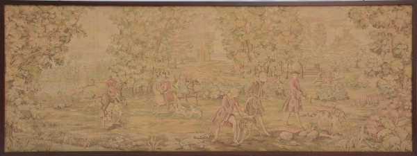 • Monumental quadro em Gobelan - O conjunto apresenta uma visão idealizada do campo, onde amor, lazer e trabalho coexistem em perfeita harmonia. O jardim não é apenas cenário, mas elemento narrativo, articulando encontros amorosos, atividades pastorais e contemplação da natureza, segundo o gosto refinado e poético típicos dos séculos XVIII e XIX.  214x120