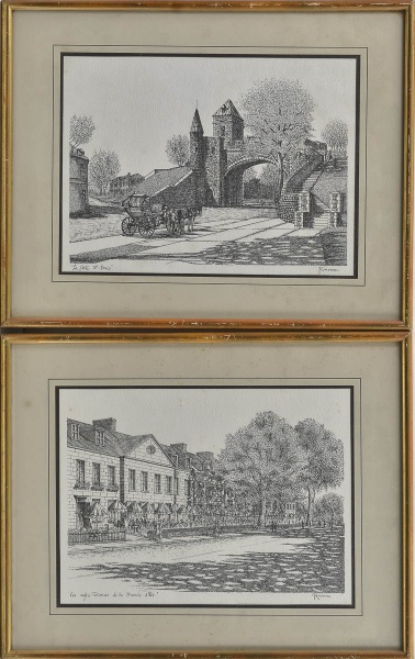 • Visite à Paris - Lote composto por pendant de impressões sobre papel Canson "La Porte St Denis" & "Les cafés terrsses de la Grande Allé" - par Rousseau. (CM 37X29 / SM 26X19)