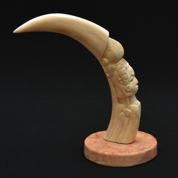 • Escultura em marfim retratando nativa com exótico penteado terminando em ponta de presa pontiaguda. No estado, apresenta partes coladas e peredas. Base circular de marmore rajado. Presa 17 cm altura x 4 cm larg / 27 cm envergadura.